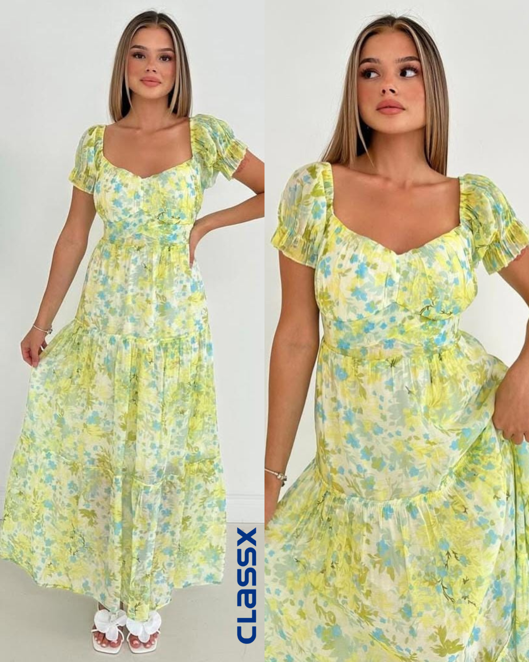 Romantična i lepršava, ova maxi haljina sa cvetnim printom stvorena je za sunčane dane i posebne trenutke. Lagana tkanina, naglašeni struk i srcoliki izrez ističu siluetu, dok kratki puf rukavi sa nežnim faltama dodaju dašak ženstvenosti. Idealna za letnje šetnje, proslave ili svakodnevno uživanje u stilu. Dostupna u tri nežne nijanse: mint, roze i žutoj.