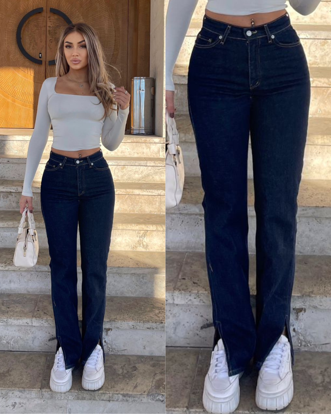 Tamne farmerke dubokog struka sa zvonastim delom nogavice koji se sužava ka kolenu i potom se ponovo...