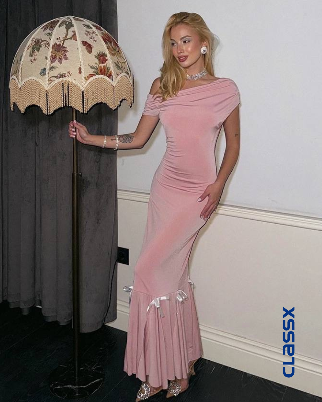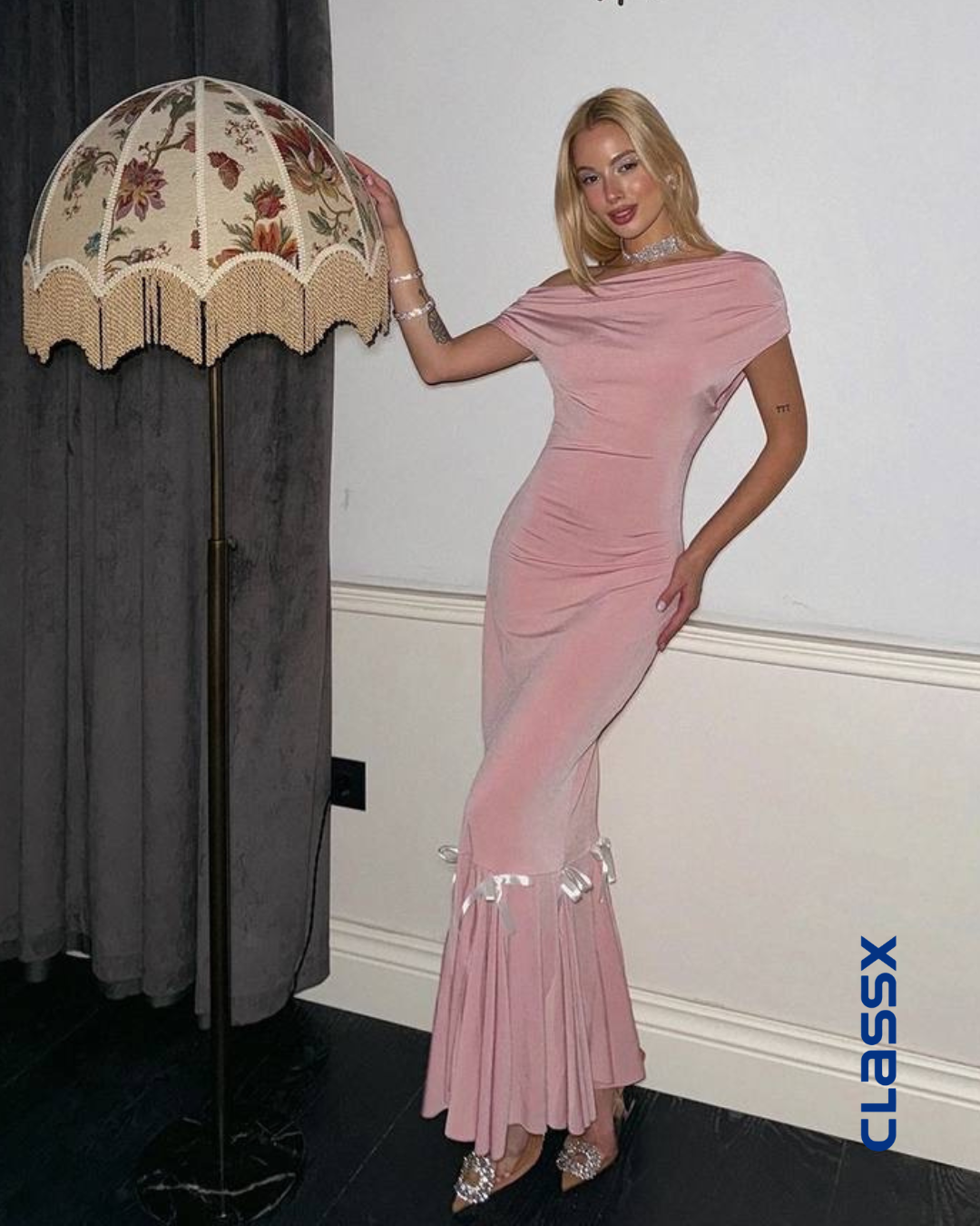 Romantična i sofisticirana haljina koja ističe eleganciju i ženstvenost. Dizajn sa spuštenim ramenima i drapiranim detaljima savršeno prati liniju tela, dok donji deo sa ukrasnim mašnama i nežnim naborima dodaje notu šarma. Idealna je za svečane prilike, gala večeri ili romantične događaje. Kombinujte je sa efektim nakitom i cipelama sa visokim potpeticama za glamurozan izgled.