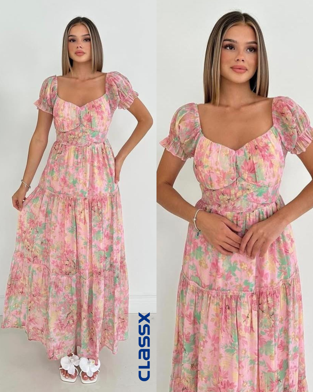 Romantična i lepršava, ova maxi haljina sa cvetnim printom stvorena je za sunčane dane i posebne trenutke. Lagana tkanina, naglašeni struk i srcoliki izrez ističu siluetu, dok kratki puf rukavi sa nežnim faltama dodaju dašak ženstvenosti. Idealna za letnje šetnje, proslave ili svakodnevno uživanje u stilu. Dostupna u tri nežne nijanse: mint, roze i žutoj.