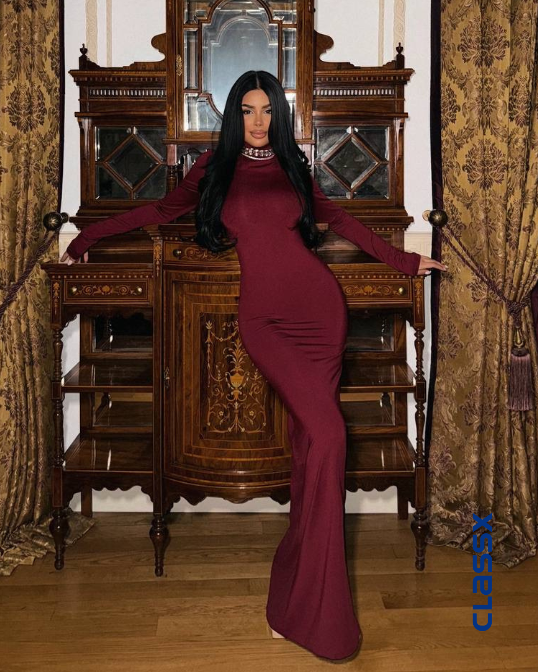 Elegantna bordo maksi haljina izrađena je od udobnog i prijanjajućeg materijala koji savršeno ističe figuru. Dugih rukava...