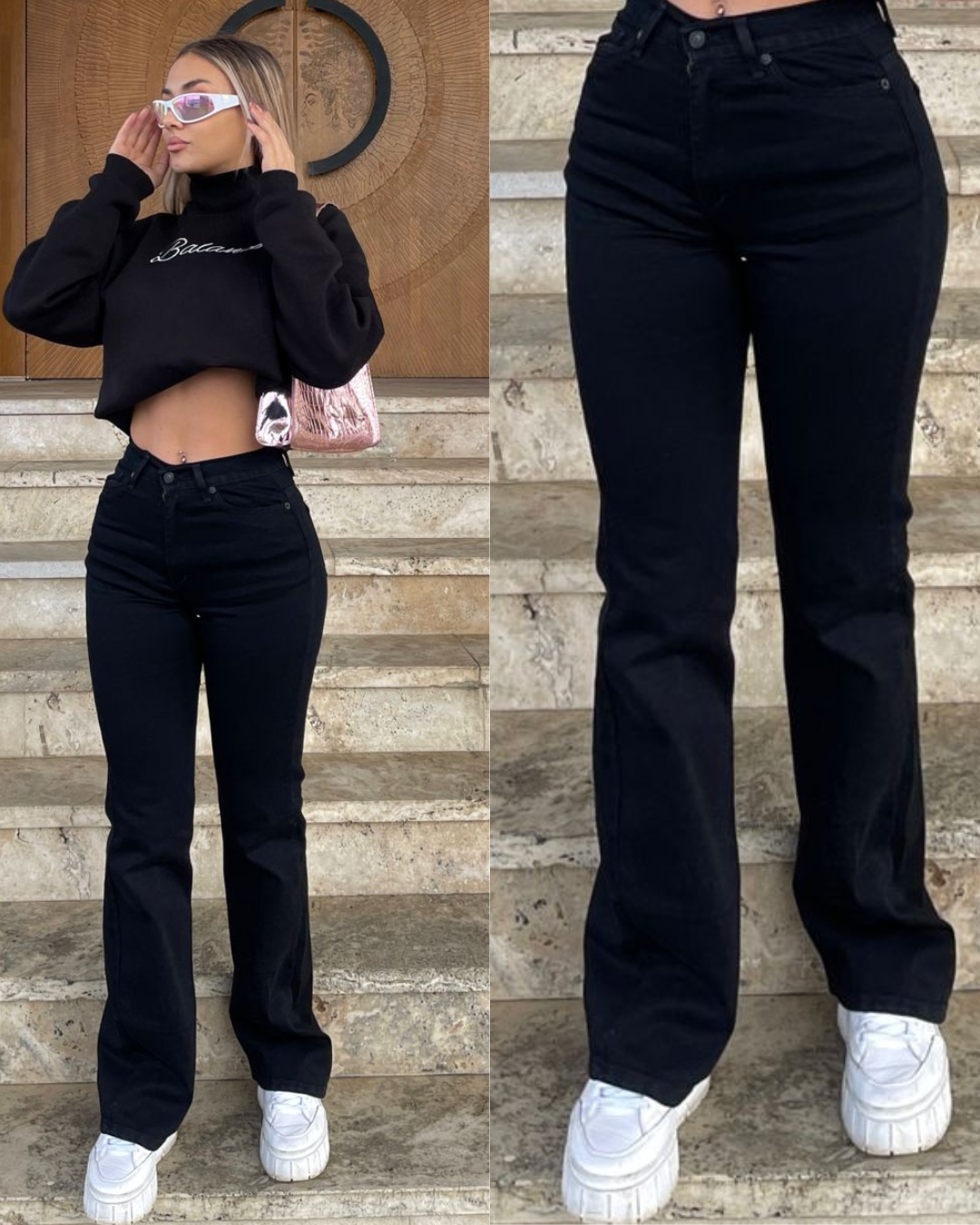 Farmerke dubokog struka sa zvonastim delom nogavice koji se sužava ka kolenu i potom se ponovo širi. Klasičan...